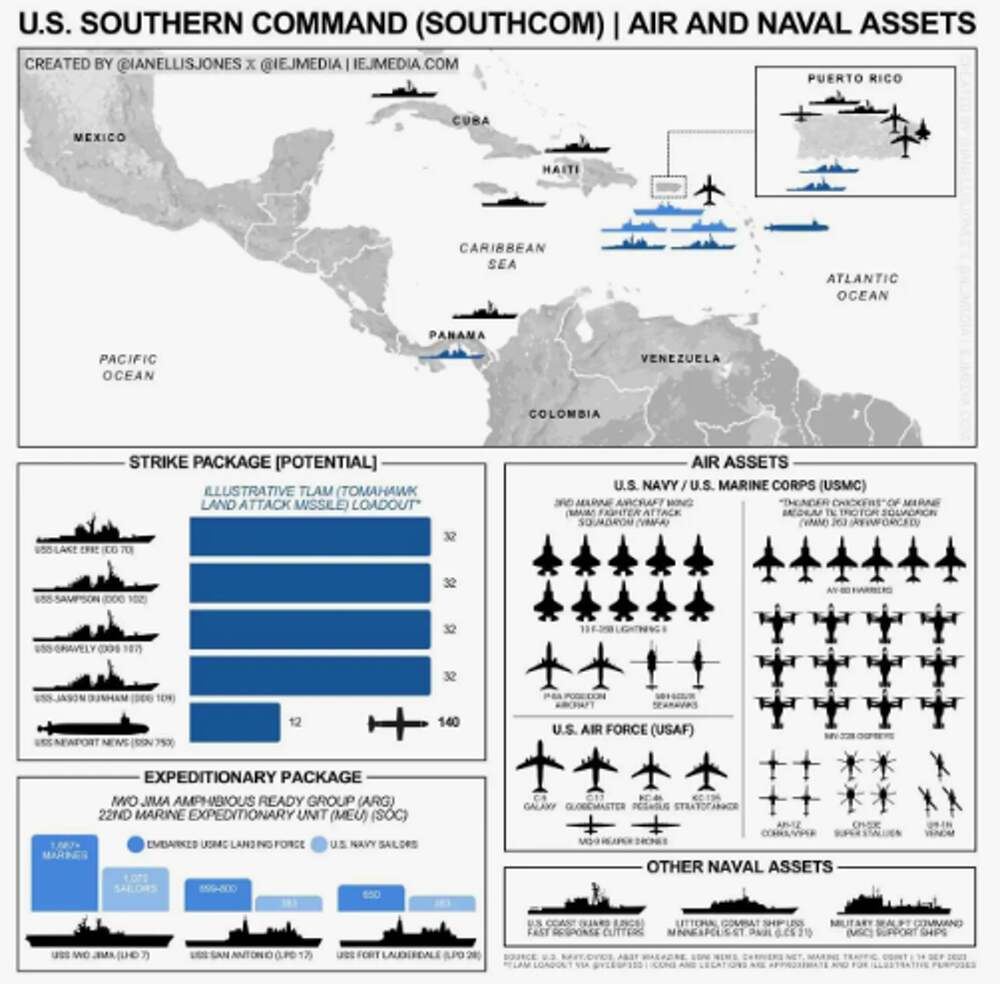 Группировка американских войск у берегов Венесуэлы может составить до 16 000 военнослужащих, следует из подсчетов The Washington Post. Масштабное наращивание военных сил и средств в Карибском бассейне указывает на то, что администрация Дональда Трампа готовится расширить операции в регионе,