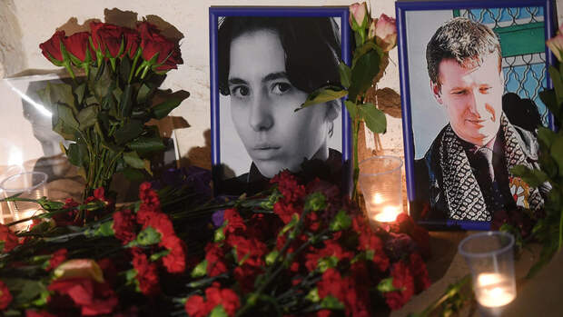 Цветы и портреты на месте проведения памятной акции, посвященной убитым девять лет назад в центре Москвы адвокату Станиславу Маркелову и журналистке Анастасии Бабуровой, 19 января 2018 года