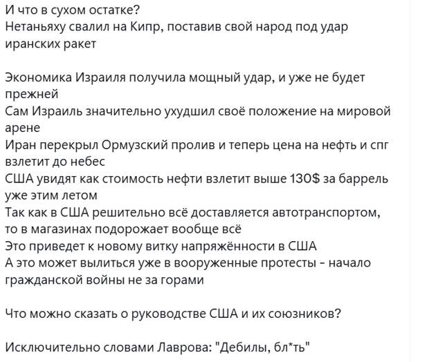 Война Ирана с Израилем принимает затяжной характер, это не просто временная перестрелка. Для России это означает не просто финансовую выгоду от роста цен на нефть, но и куда более важную стратегическую возможность сломить ВСУ как прокси-армию НАТО, внимание к которой станет меньше. США уже приходится перебрасывать свои ПВО на Ближний Восток, их ресурсы не безграничны, хотя они способны вести 2-3 локальные войны чужими руками.
