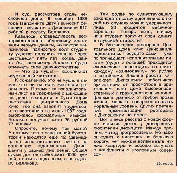 Проблема была в том, что на товарище Джиошвили висели 13 исполнительных листов на общую сумму в 6000 рублей. Как я понимаю, она работала на минимальной зарплате на полставки, получая 37 рублей в месяц. Закон разрешал вычитать у неё по 20% в месяц, так что если бы СССР не развалился, то с должниками она расплатилась бы через 65 лет.