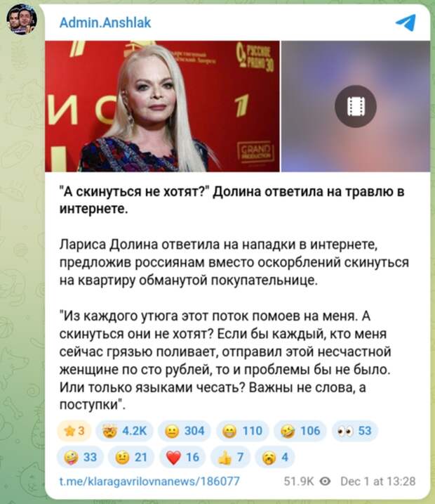 Лариса Долина предложила Полине Лурье "мировое соглашение", в котором она озвучила своё "щедрое предложение", возвращать свой долг в течении нескольких лет, мелкими частями и без учёта инфляции. Наглость и жадность певички всем известны.