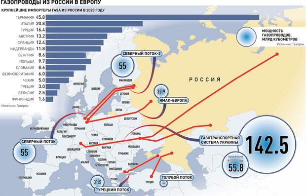 По добыче газа в Европе лидирует Россия, а по потреблению — ЕС. Рынок газа Евросоюза дефицитен, и этот дефицит возрастает, увеличившись с 232 миллиардов кубометров в 2014 году до 343 миллиардов кубометров в 2020-м. Евросоюзу удалось стабилизировать потребление газа, но его добыча в ЕС быстро падает, поэтому импорт растет. В 2019 году добыча сократилась на 10,8 процента, а в 2020 году — на 25,5 процента. Последняя страна ЕС, которая имела положительный баланс газа, — Дания — в 2020 году стала нетто-импортером.